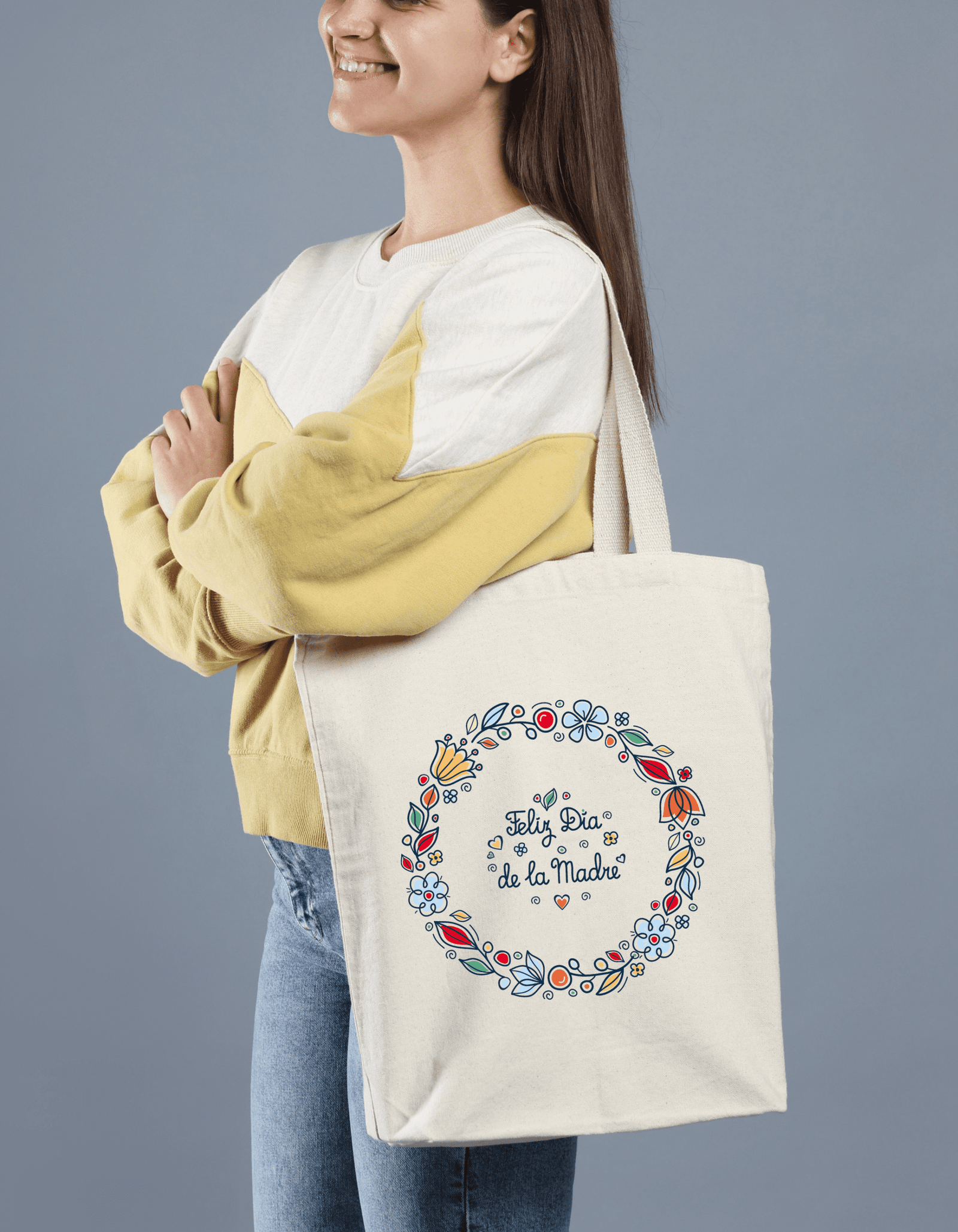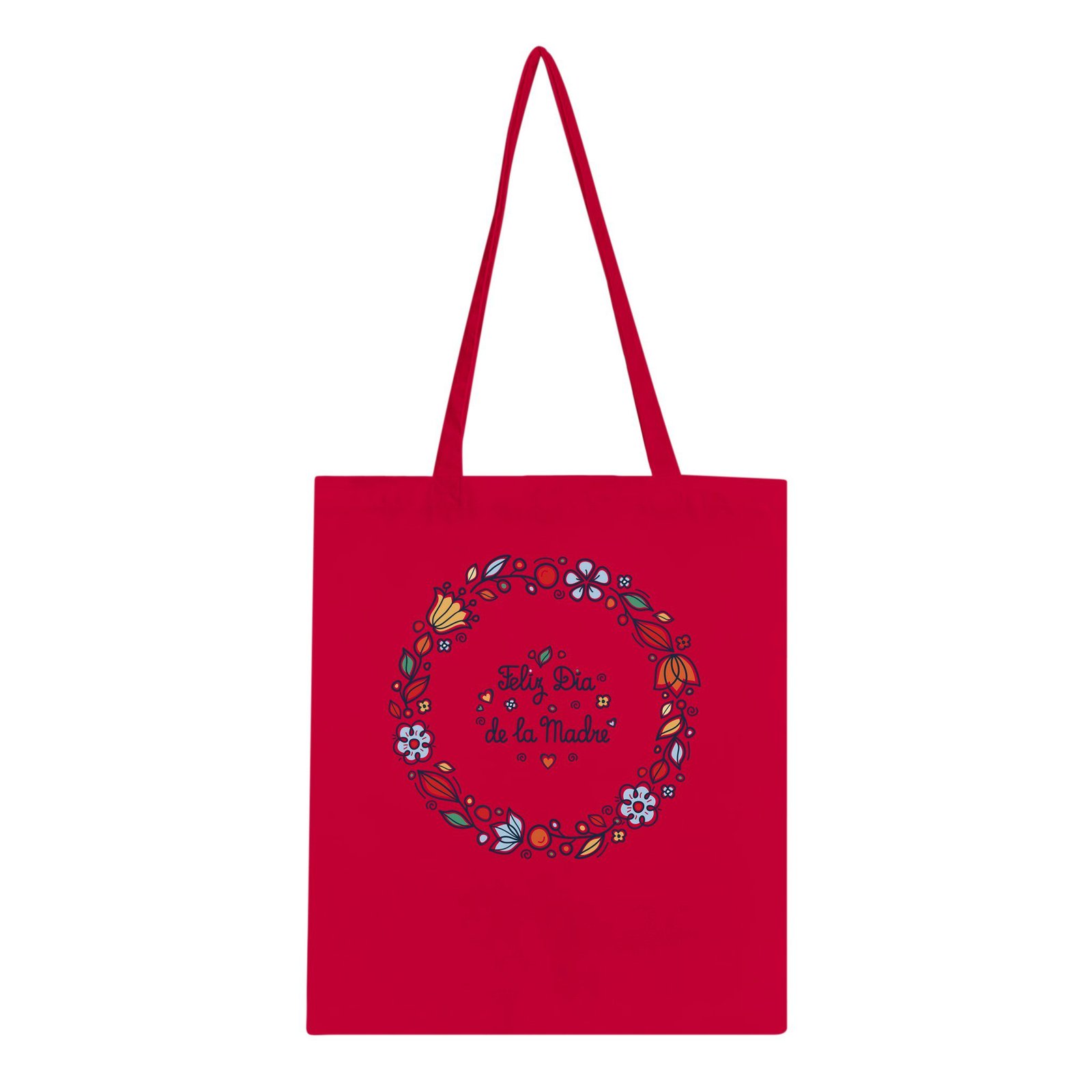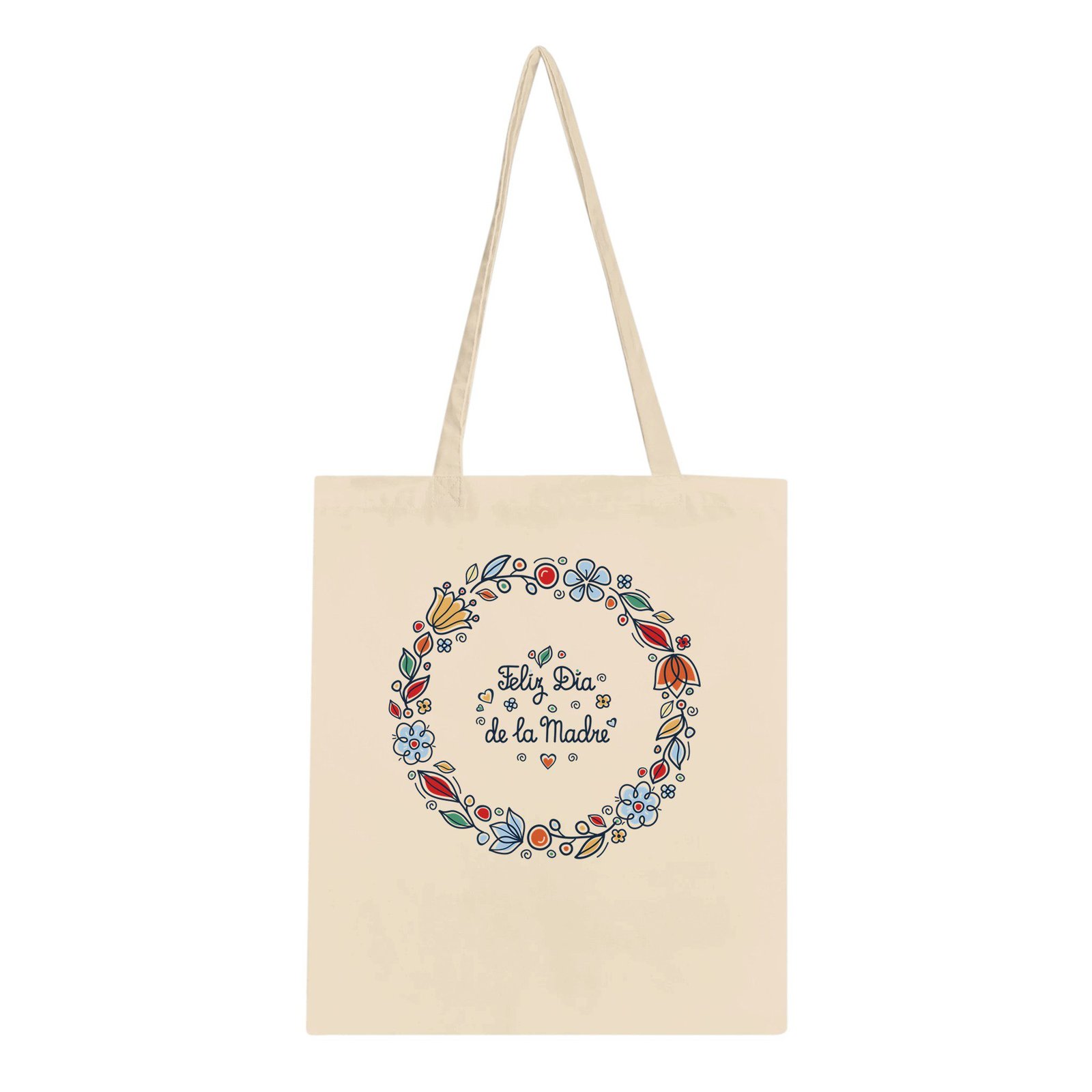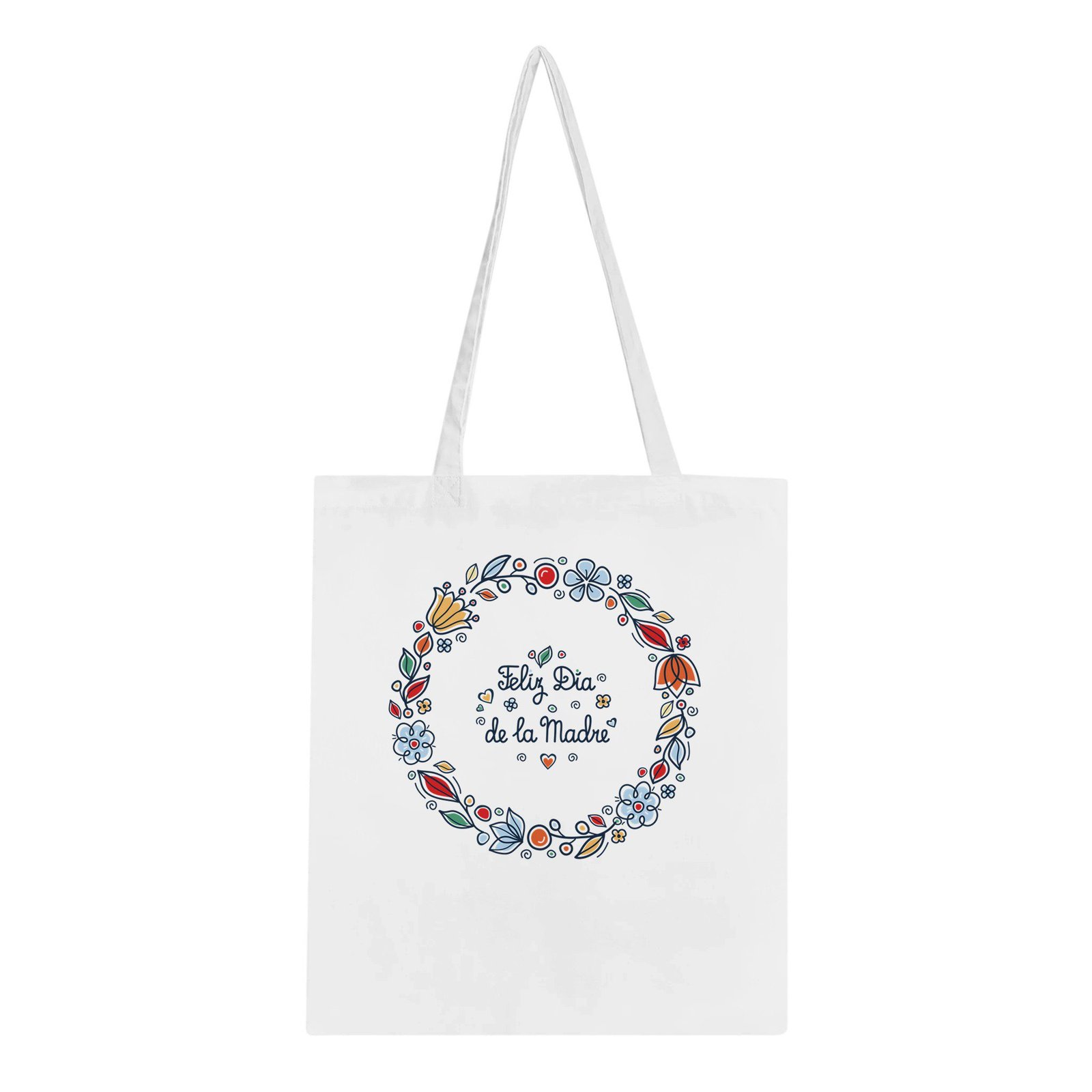 Bolsa tote de tela con un bonito diseño floral y el mensaje “Feliz Día de la Madre”, perfecta como regalo especial para mamá.