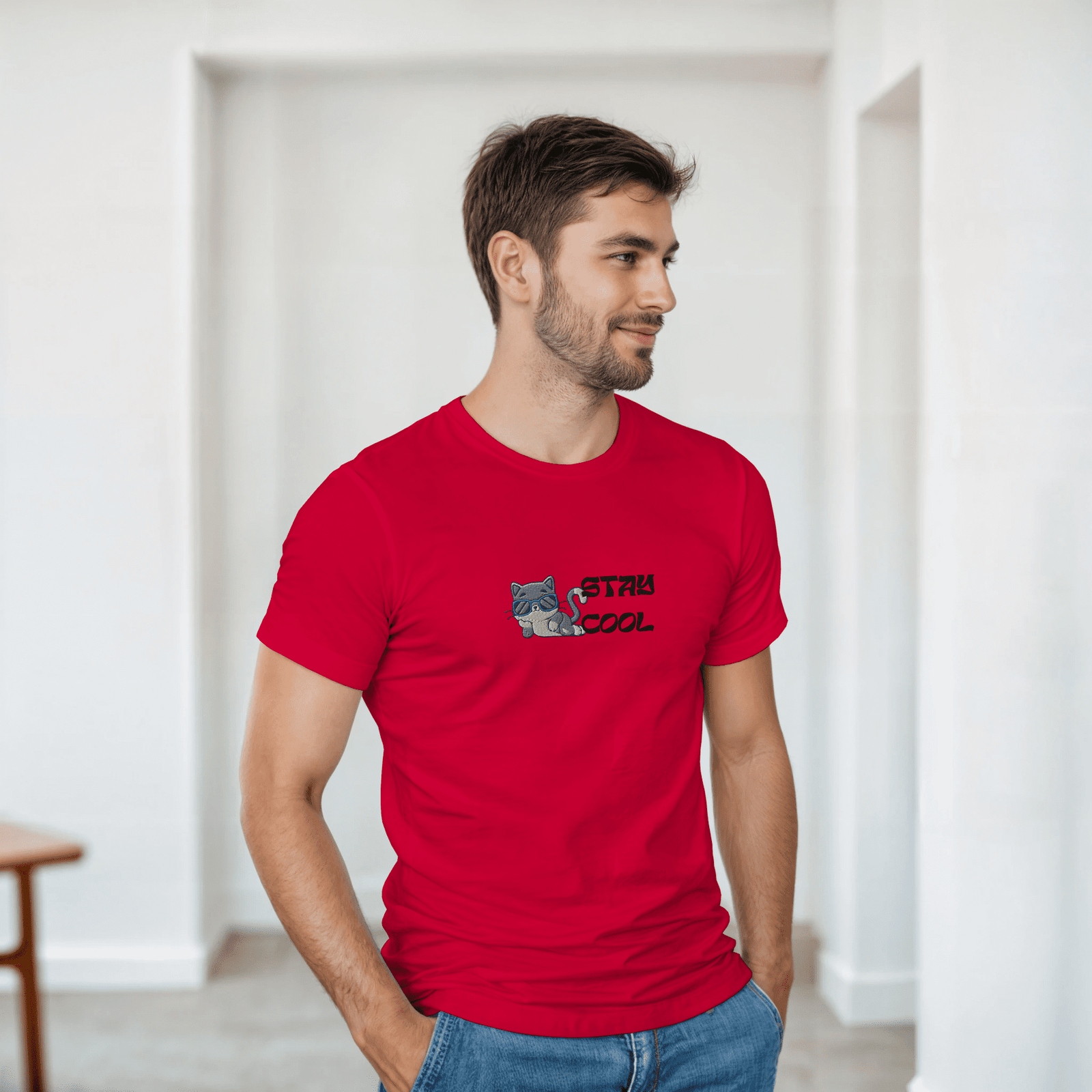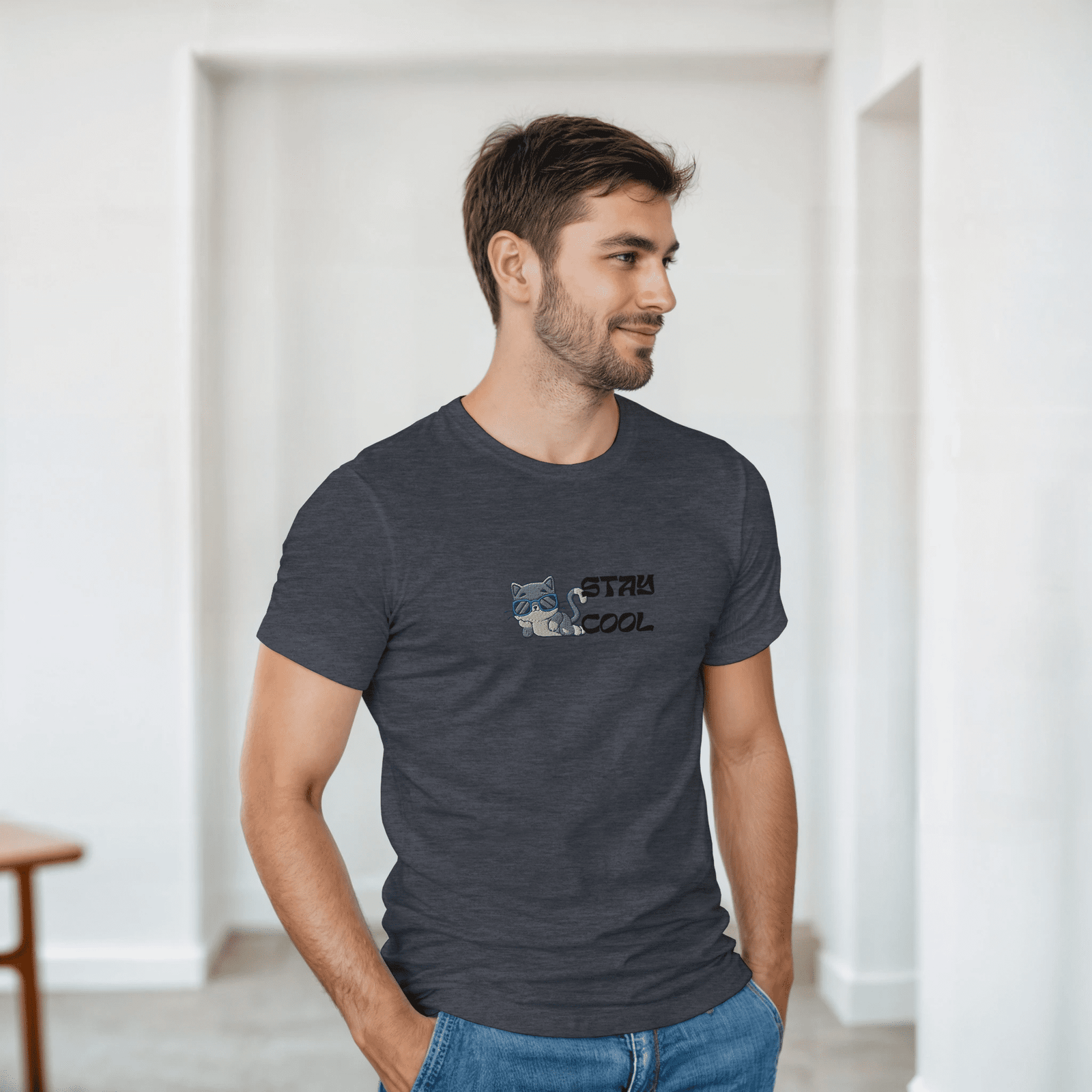 Haz una declaración de estilo con esta camiseta bordada unisex, que presenta un simpático gato con gafas de sol y el mensaje “Stay Cool”. Su diseño combina humor, actitud relajada y un toque moderno que la hace perfecta para cualquier ocasión informal.