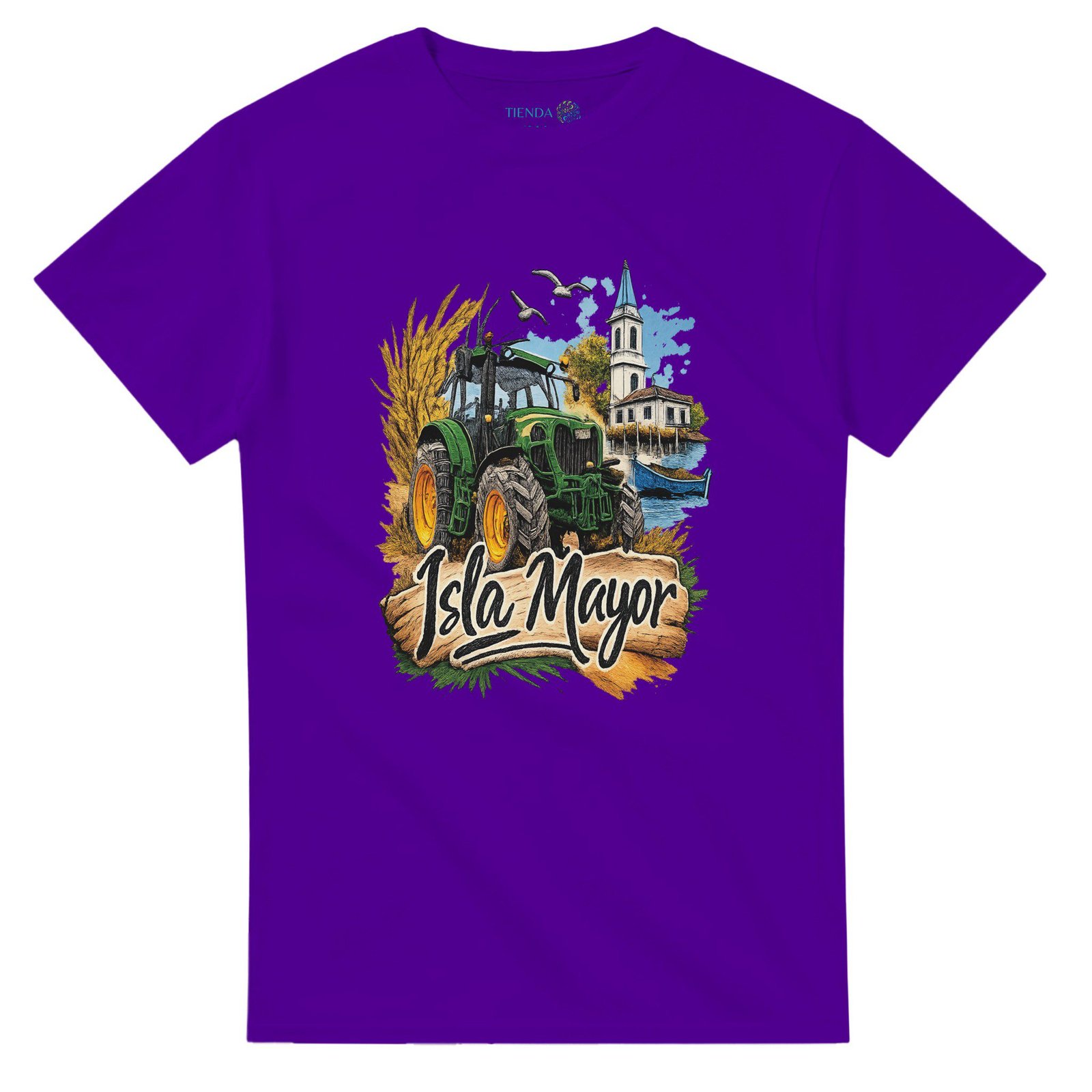 Isla Mayor es conocida por sus extensos arrozales y su fuerte vínculo con el campo, y esta camiseta captura ese paisaje tan característico con un diseño moderno y lleno de personalidad.