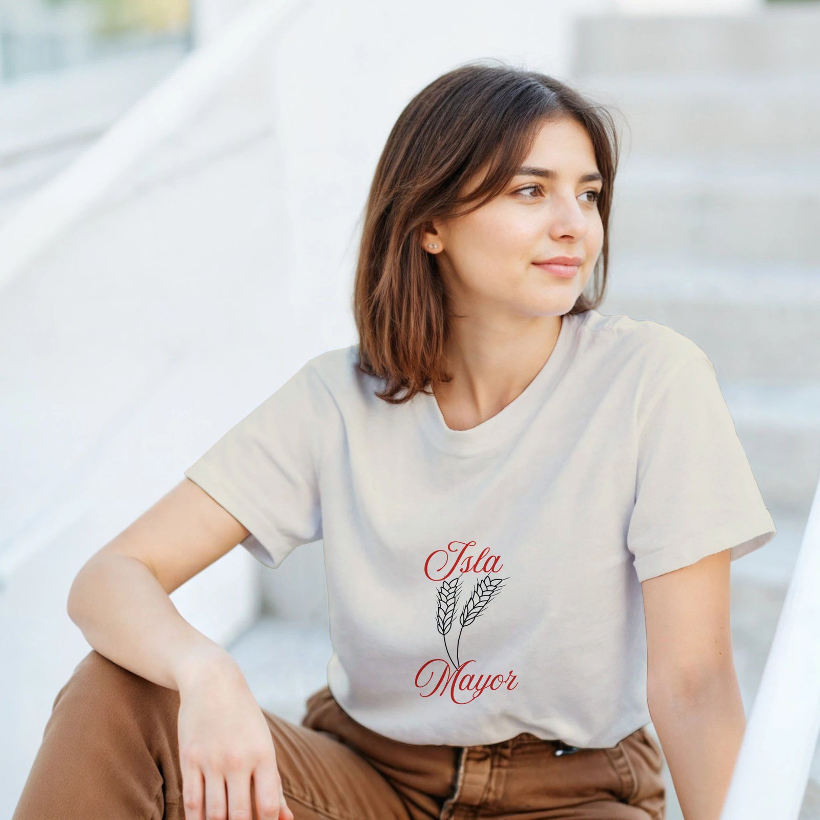 Camiseta de algodón 100% con diseño inspirado en Isla Mayor y sus campos de arroz, con un estilo sencillo y elegante que representa la identidad y tradición del pueblo.