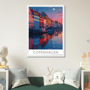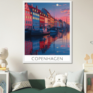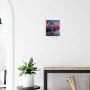 Este cuadro decorativo de Copenhague muestra una vibrante ilustración urbana con reflejos al atardecer, ideal para quienes aman el estilo moderno y los viajes. Su diseño colorido y detallado transforma cualquier espacio en un rincón lleno de inspiración y elegancia nórdica.
