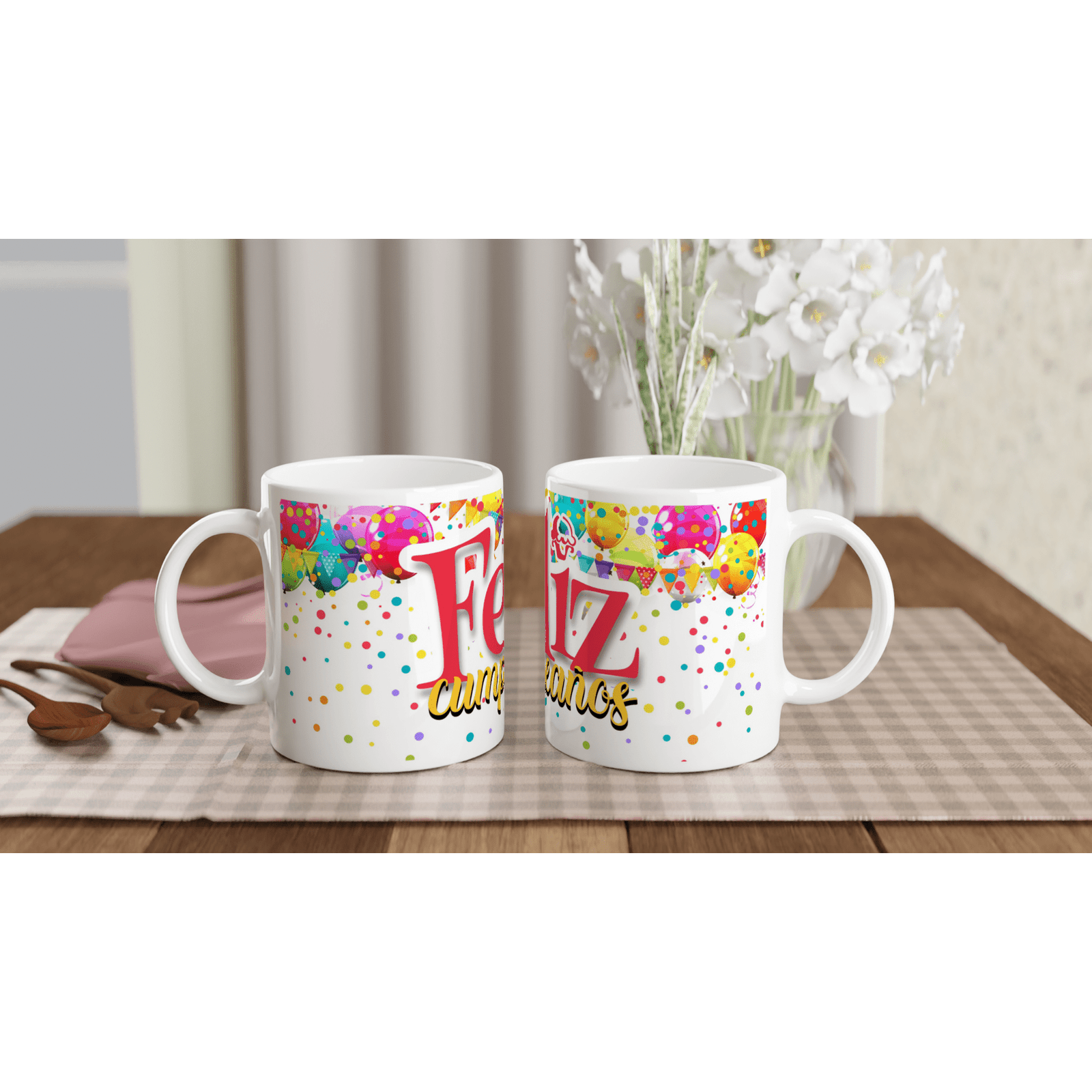 Haz que cada cumpleaños sea aún más especial con esta taza de cerámica de 325 ml con diseño “Feliz Cumpleaños”. Su fondo blanco brillante resalta los colores vivos de globos, confeti y tipografía festiva, creando un detalle alegre y práctico que encantará a cualquiera.