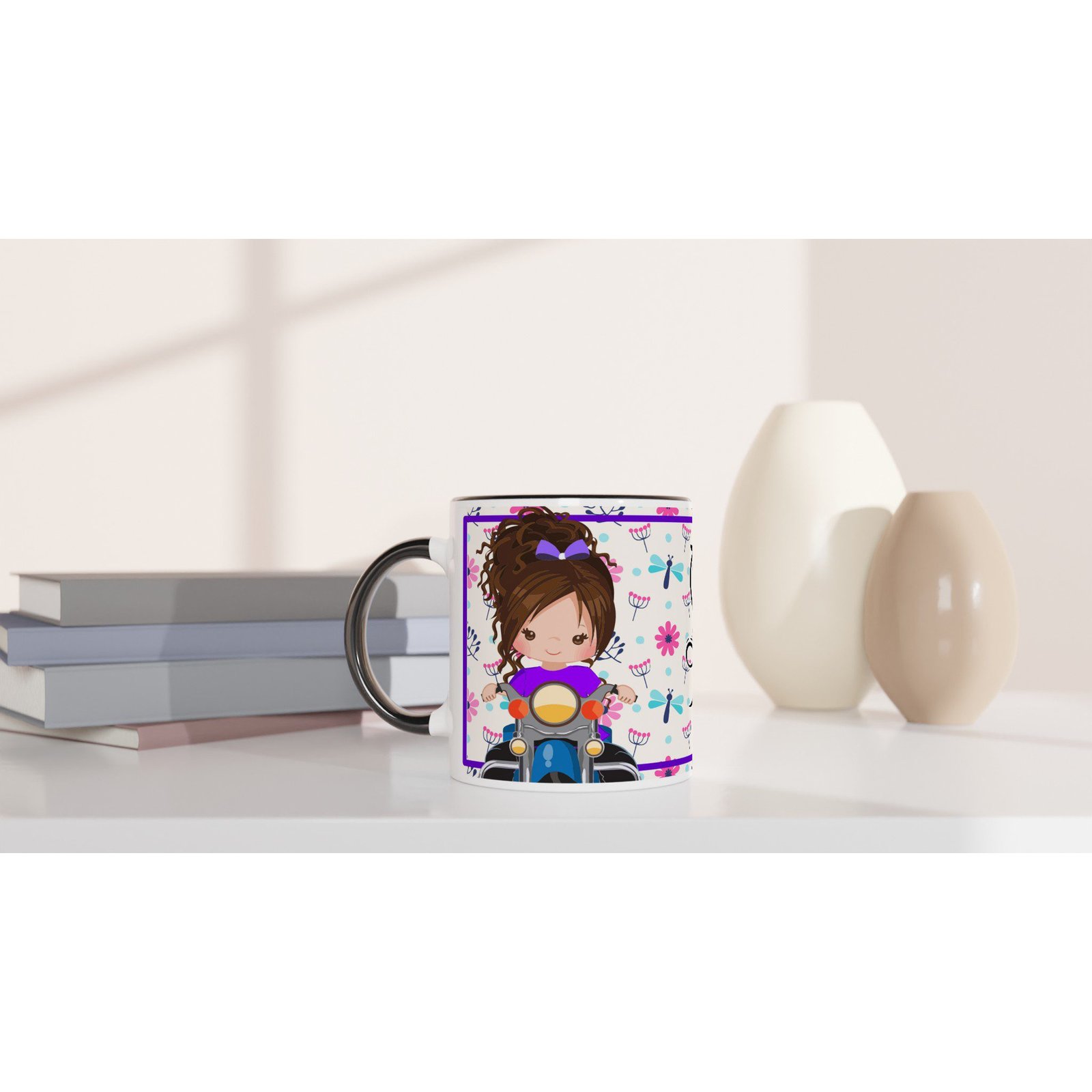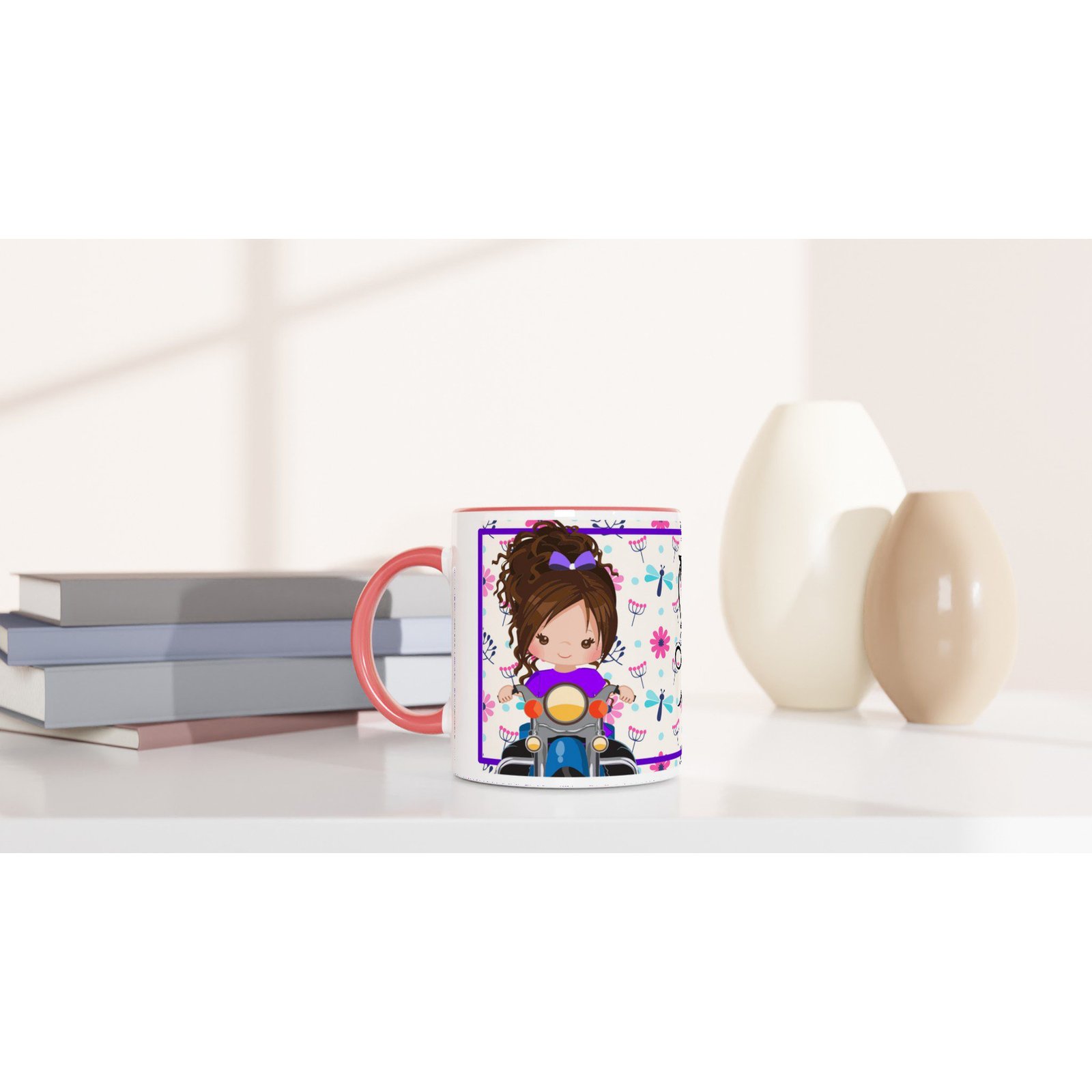 - Cerámica blanca brillante con interior, asa y borde en color.
