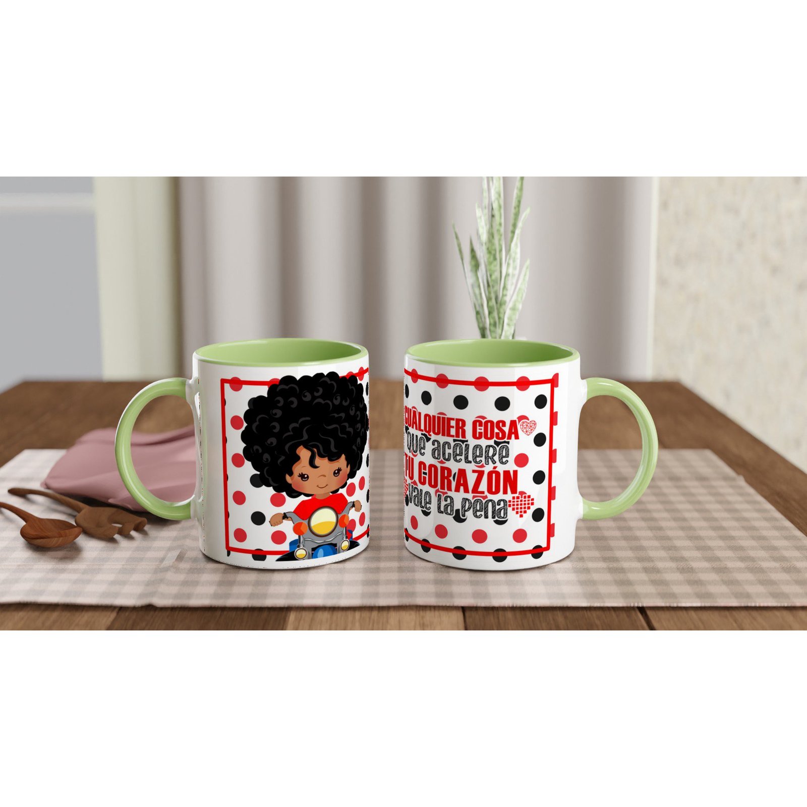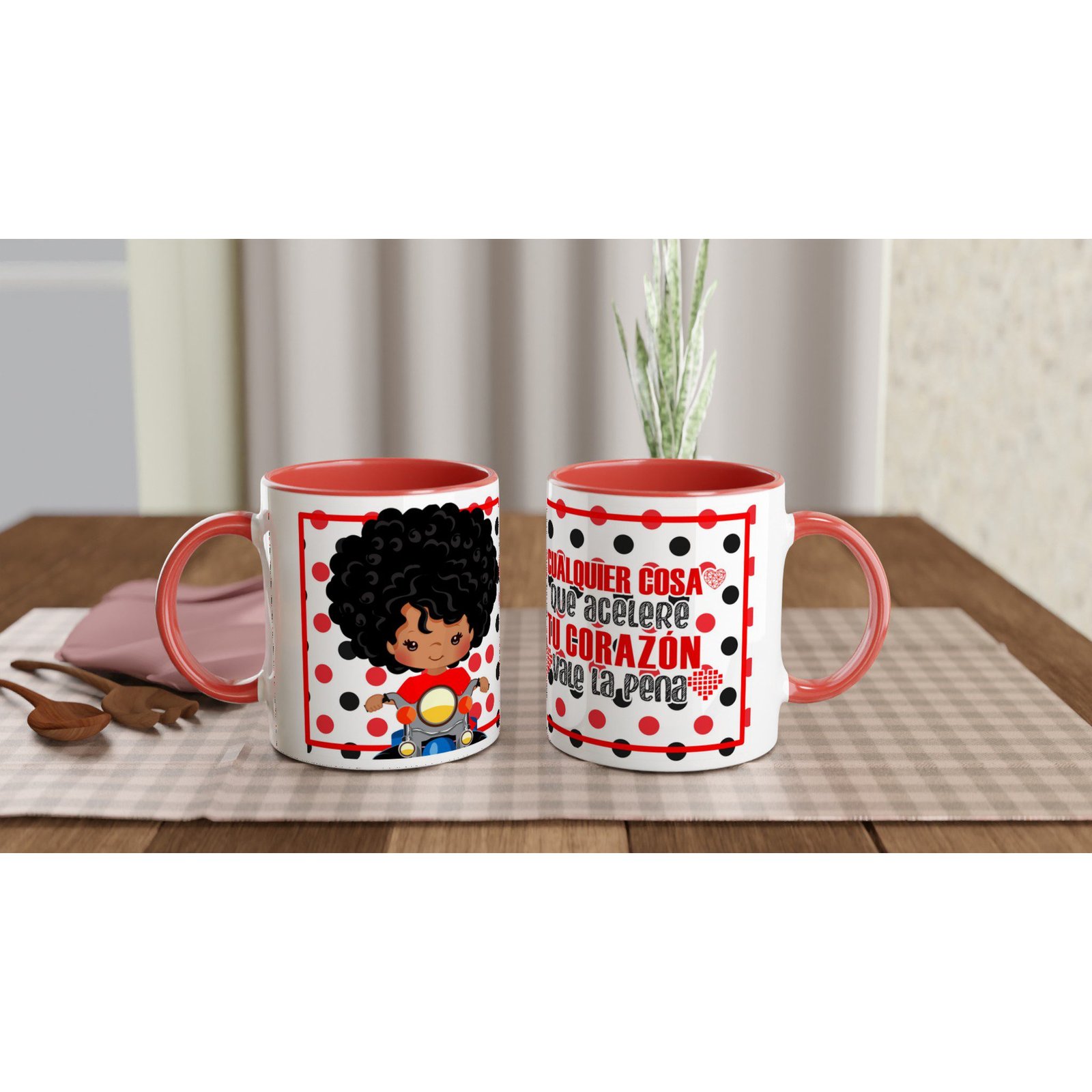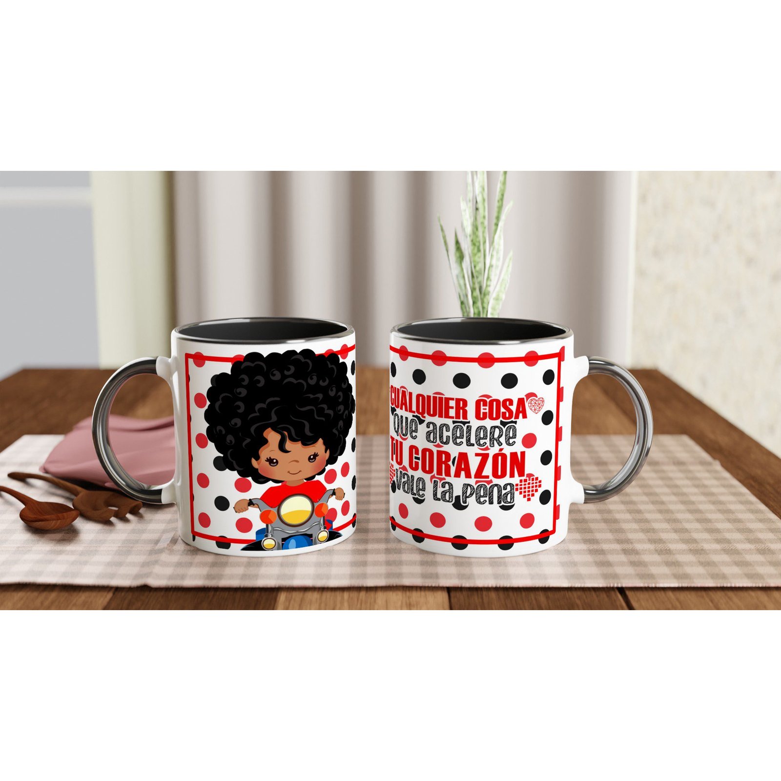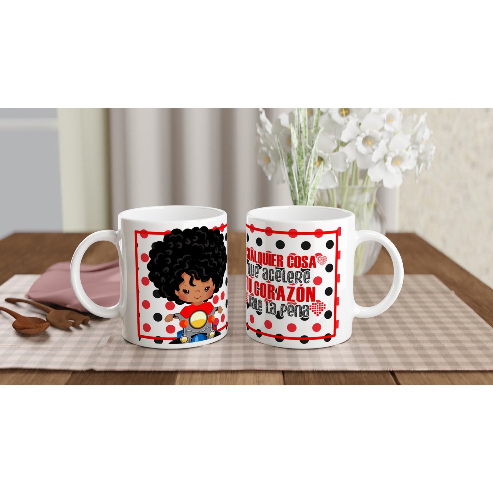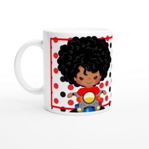 Disfruta de tus bebidas favoritas con estilo gracias a esta taza de cerámica blanca de 325 ml con diseño motero y estampado de lunares. Ideal para café, té, chocolate o cualquier bebida caliente, es práctica y original.