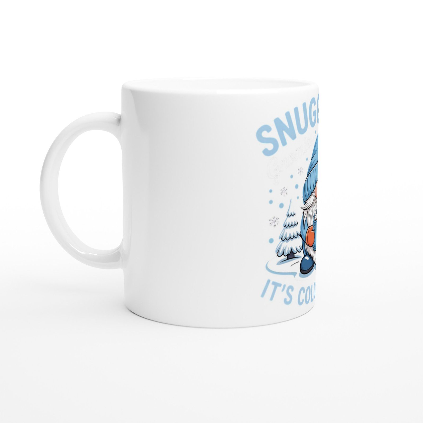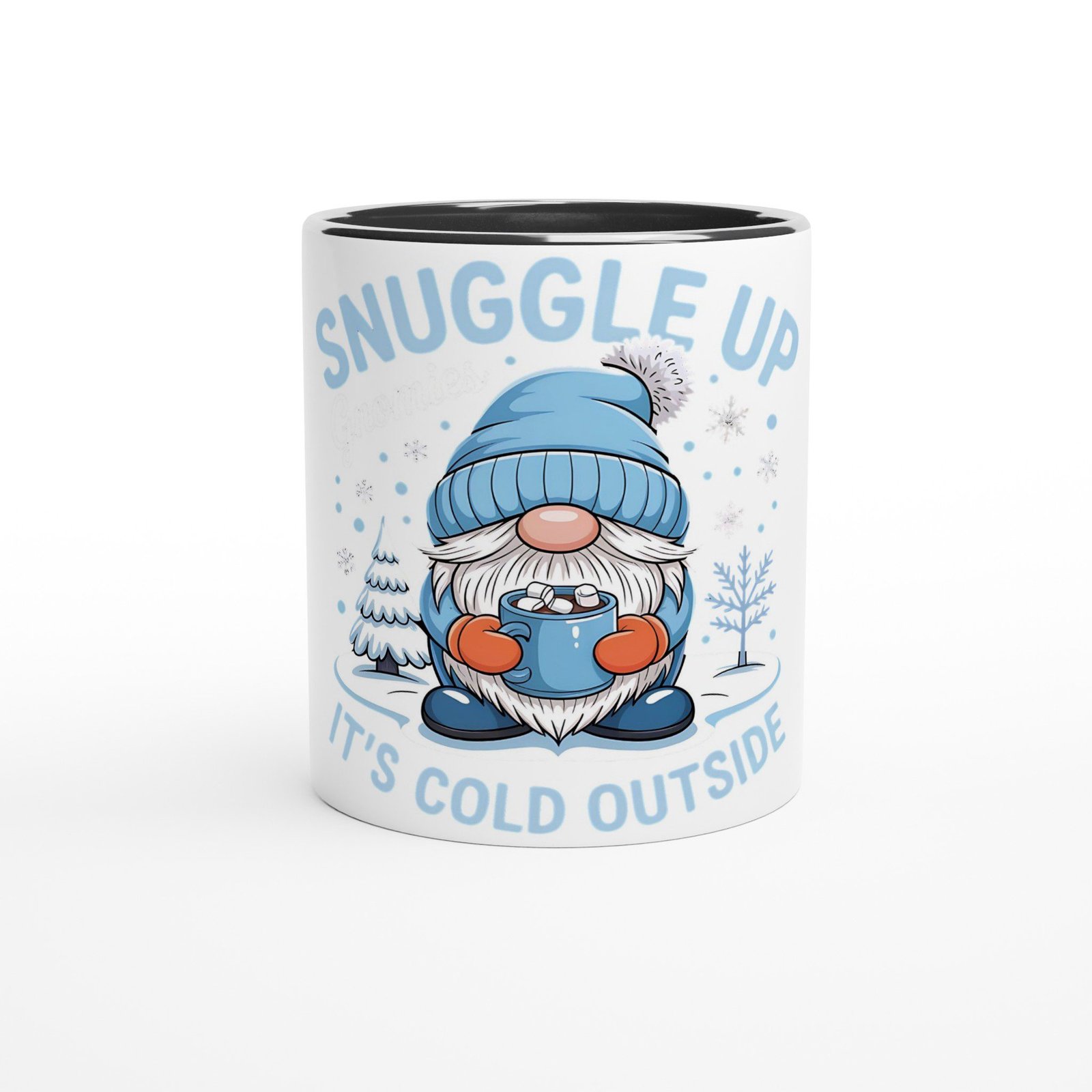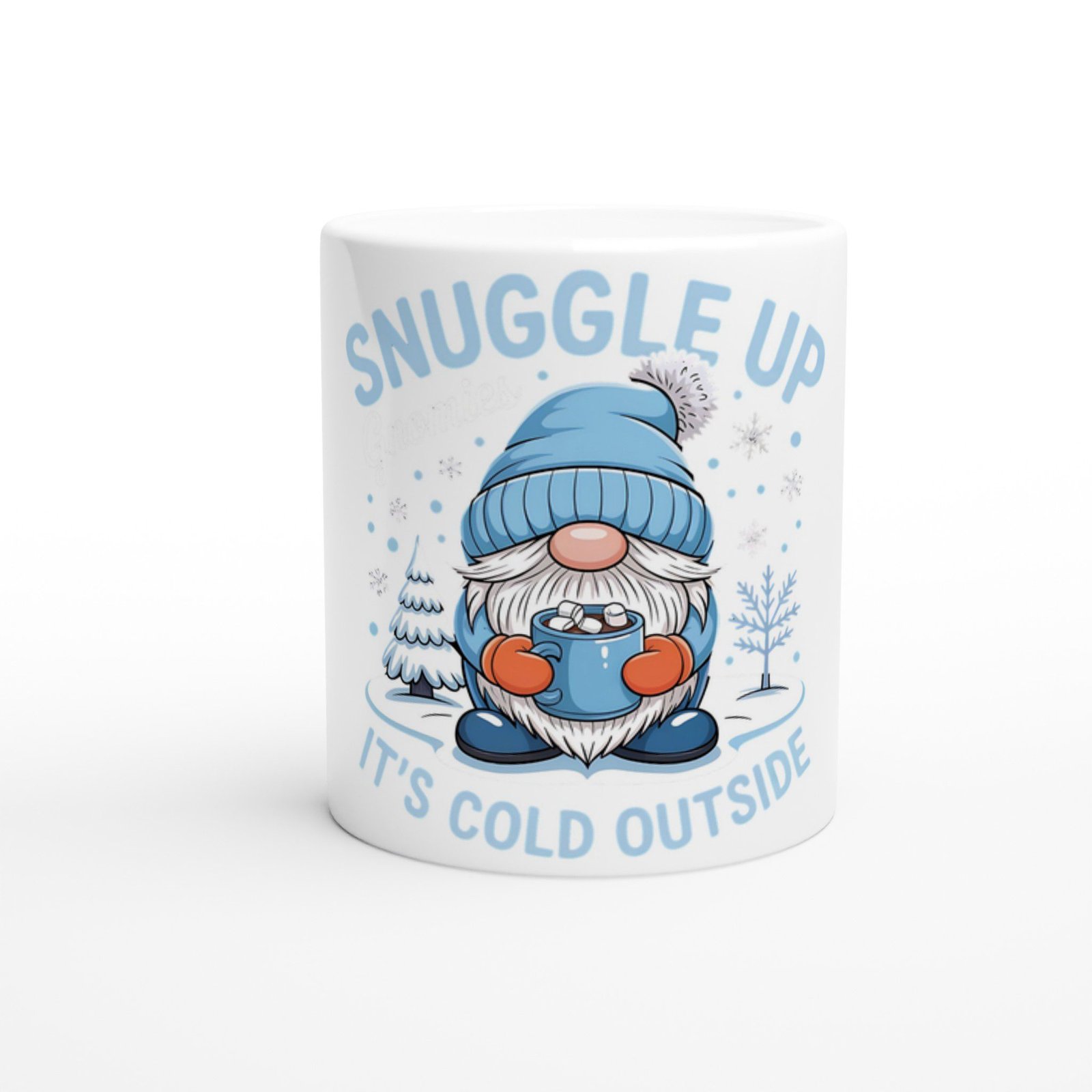 El diseño muestra un simpático gnomo abrigado con gorro azul sosteniendo una taza caliente mientras la nieve cae a su alrededor, acompañado del mensaje “Snuggle Up – It’s Cold Outside”, transmitiendo una sensación de tranquilidad y confort.