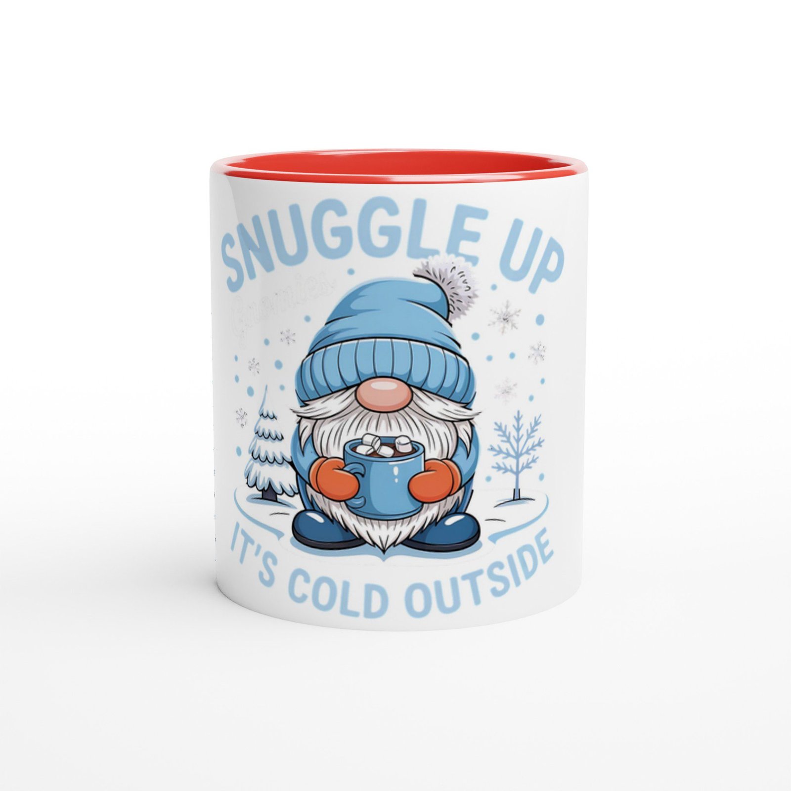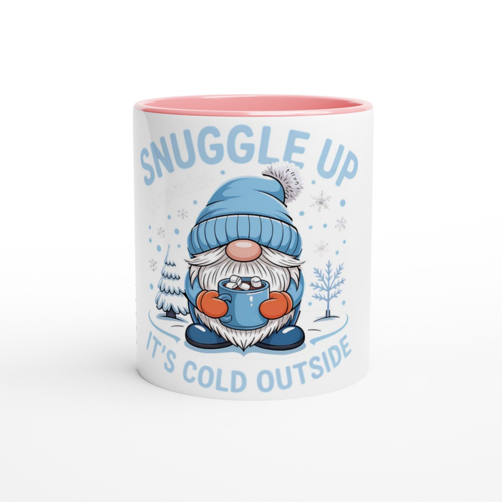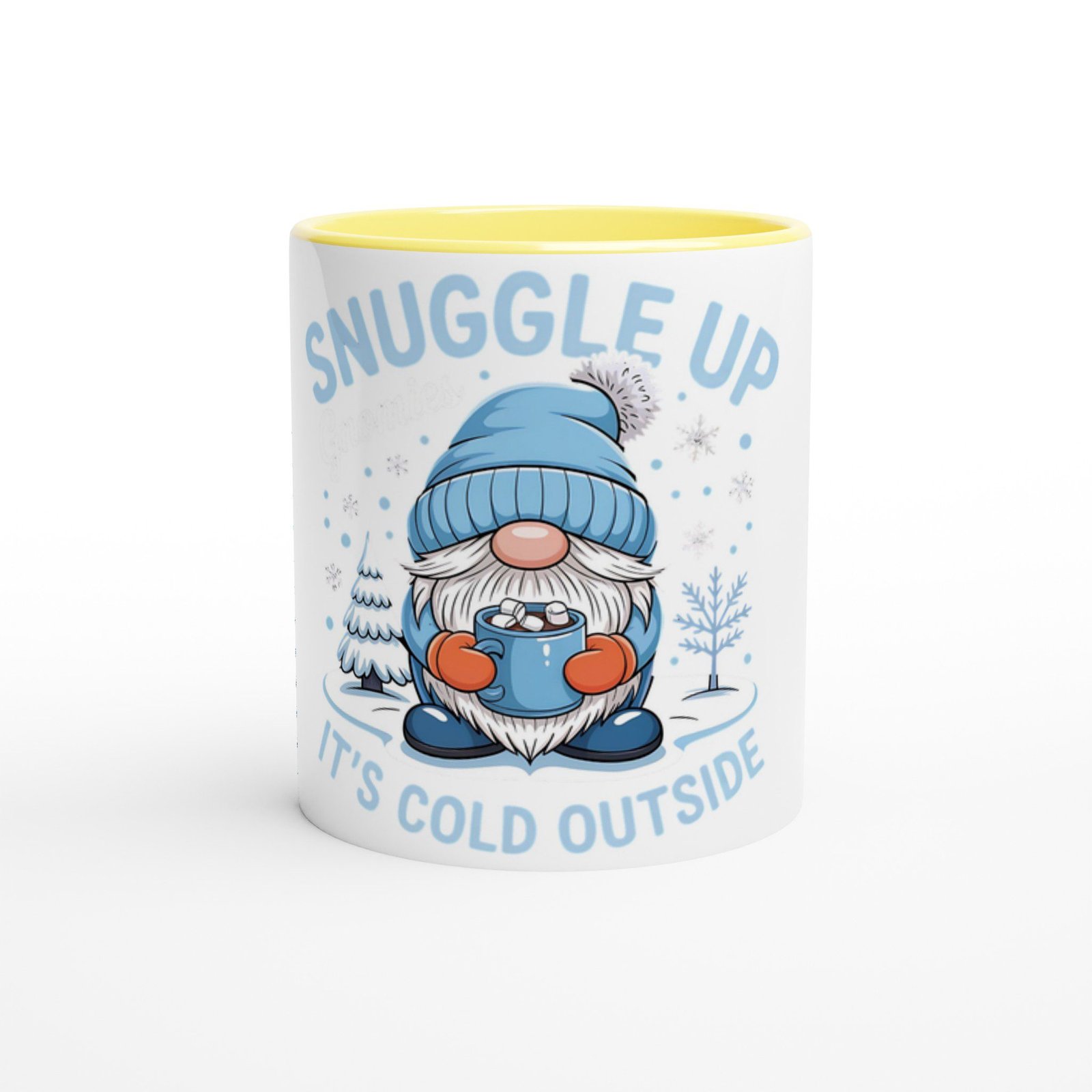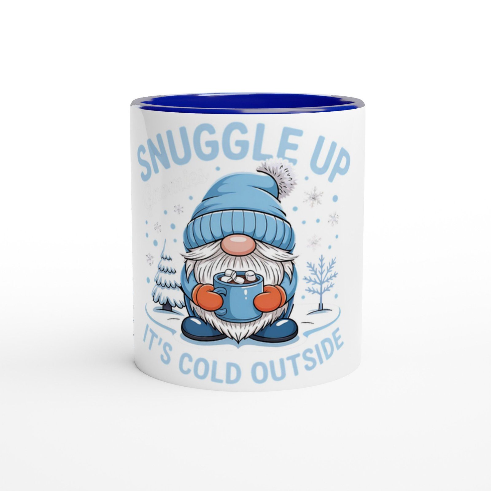 El diseño muestra un simpático gnomo abrigado con gorro azul sosteniendo una taza caliente mientras la nieve cae a su alrededor, acompañado del mensaje “Snuggle Up – It’s Cold Outside”, transmitiendo una sensación de tranquilidad y confort.