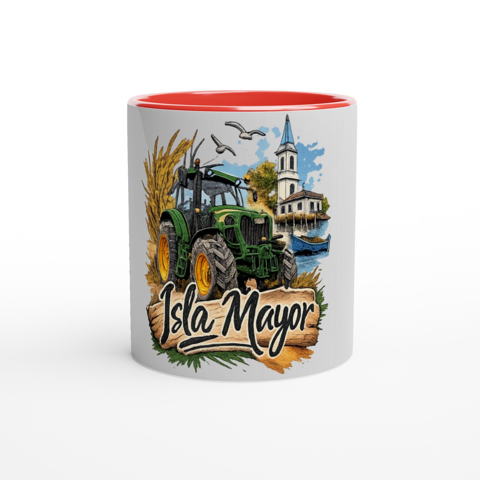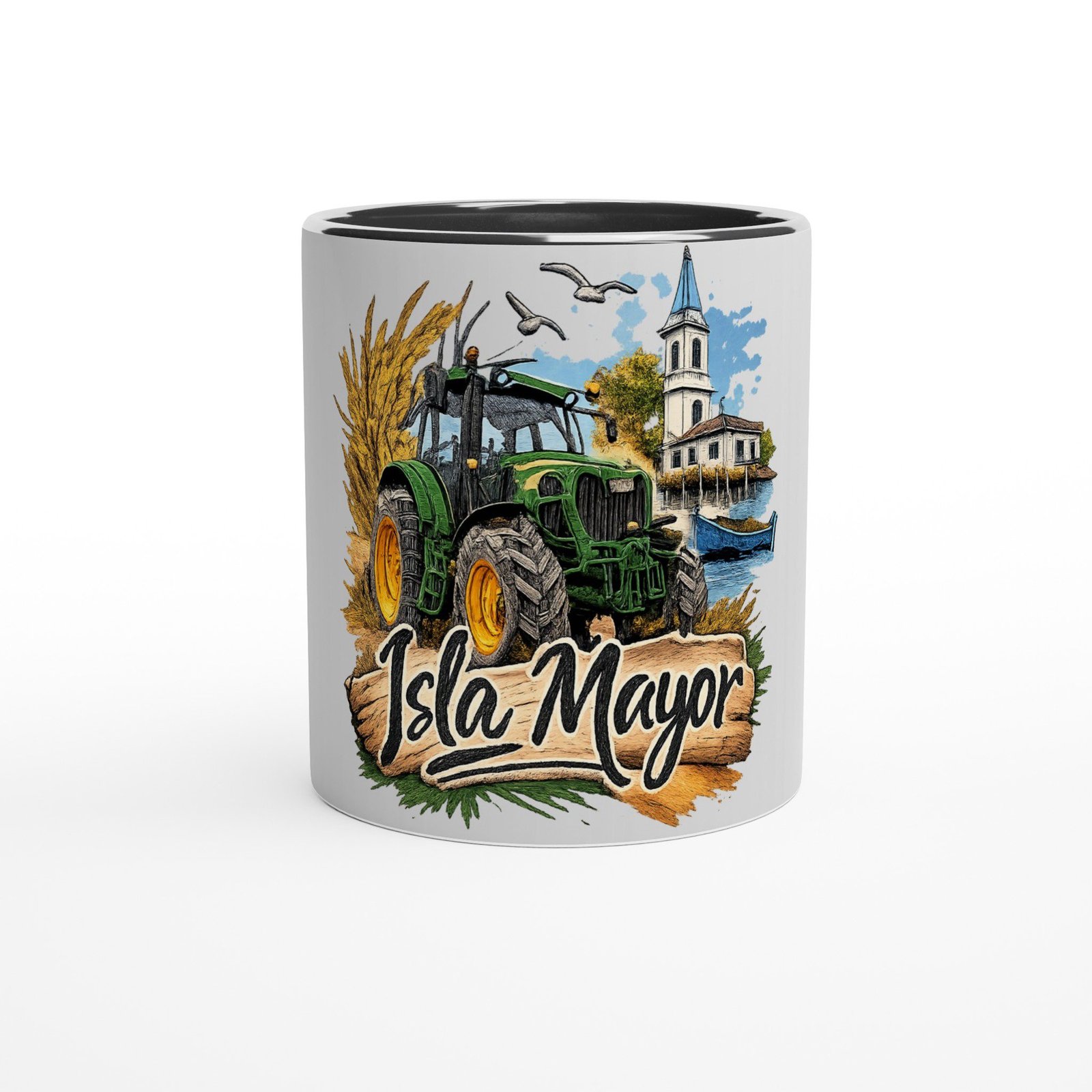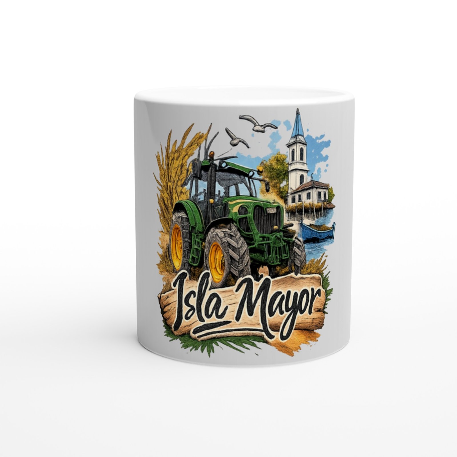 Disfruta de tu café o bebida favorita con esta taza de cerámica con diseño inspirado en Isla Mayor, un homenaje a la tradición agrícola y al paisaje único de este municipio sevillano.