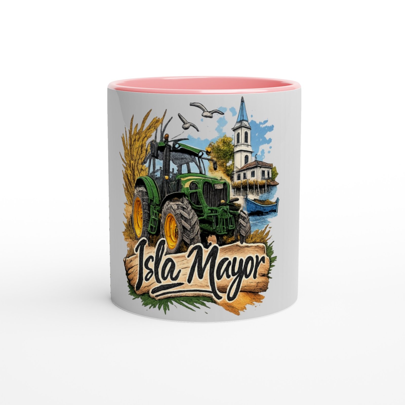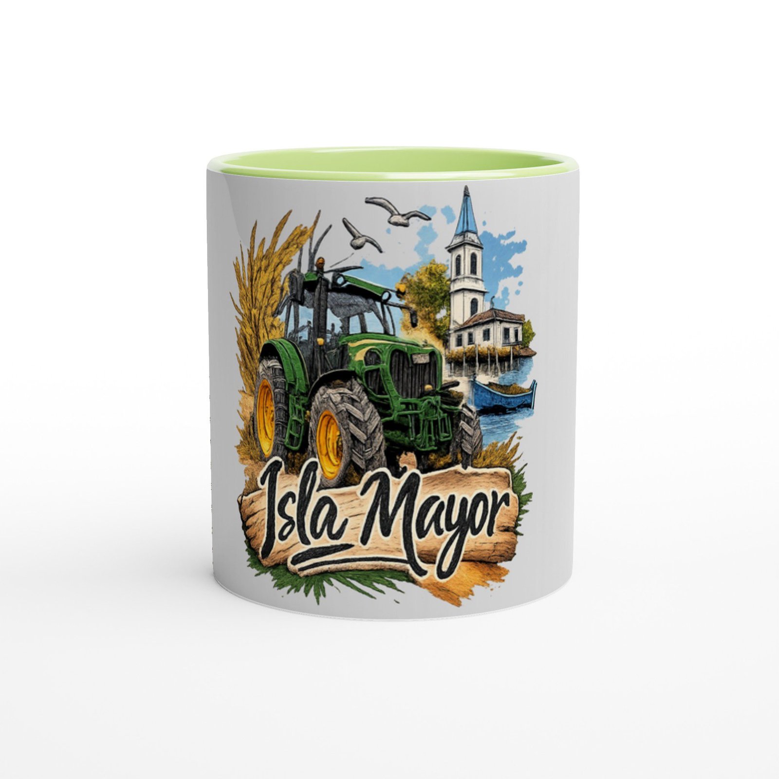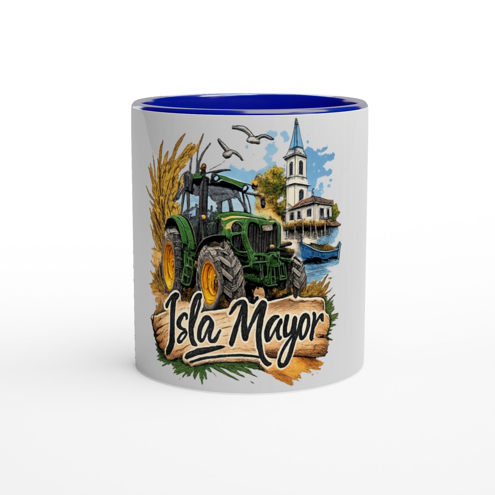 Disfruta de tu café o bebida favorita con esta taza de cerámica con diseño inspirado en Isla Mayor, un homenaje a la tradición agrícola y al paisaje único de este municipio sevillano.